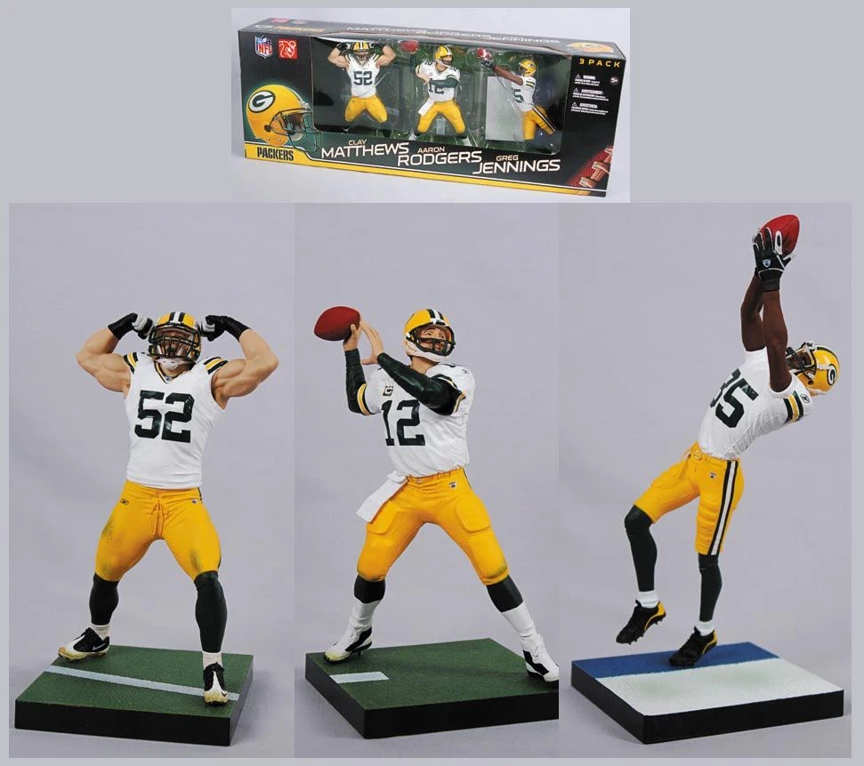 In diesem 3-Pack sind die Football-Figuren von Aaron Rodgers, Clay Matthews und Greg Jennings im weißen Jersey der Packers enthalten.